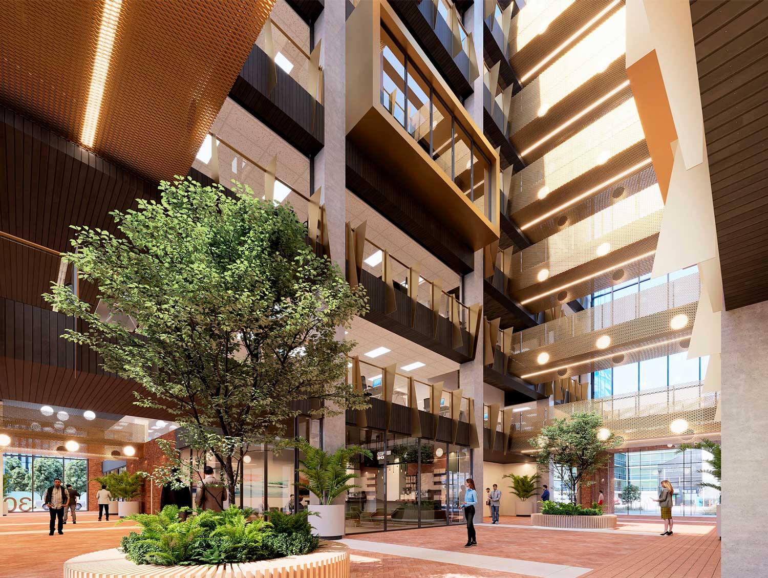 New commercial development consisting of 8 levels of commercial office spaces, retail units, 2 levels of basement car parking and end-of-trip facilities. Full height atrium extends through the whole building with inter-connecting bridges.
